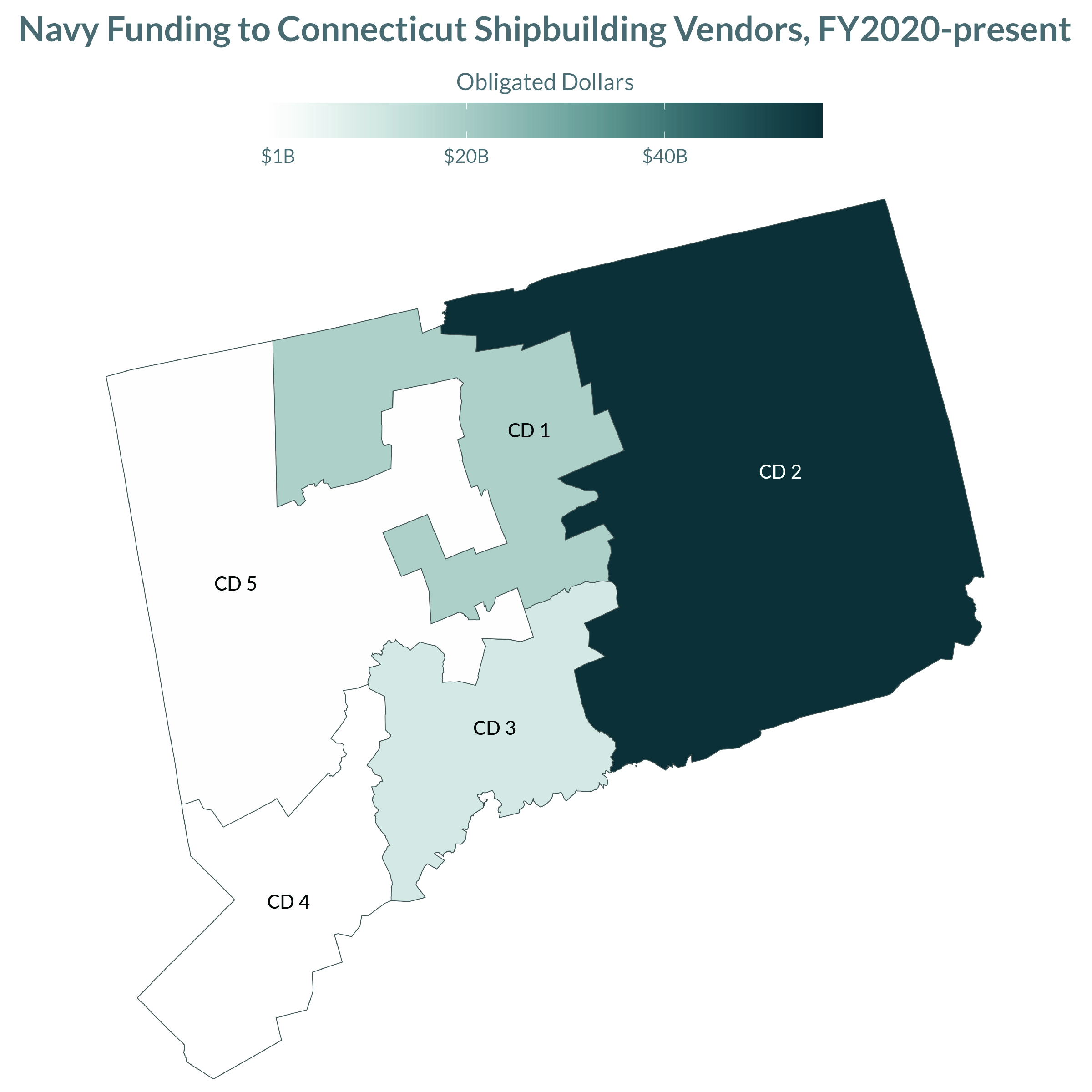 Connecticut presents a different but equally critical picture of economic dependency. The supplier network is robust and widespread, with heavy concentrations in CD 1 (313 suppliers), CD 5 (255 suppliers), and CD 3 (248 suppliers). Suppliers in these districts represent a particularly important supply base for General Dynamics Electric Boat, which is located in Connecticut’s 2nd Congressional District. Home to Electric Boat and 177 other shipbuilding suppliers, CD 2 has captured the vast majority ($55.8B) of the $85.1B in prime Navy contracts awarded to Connecticut’s shipbuilding industrial base. Therefore, a government shutdown delivers a two-pronged blow to Connecticut: it freezes payments to hundreds of small-business suppliers across the state while simultaneously paralyzing the most important economic engine in the entire eastern half of Connecticut.