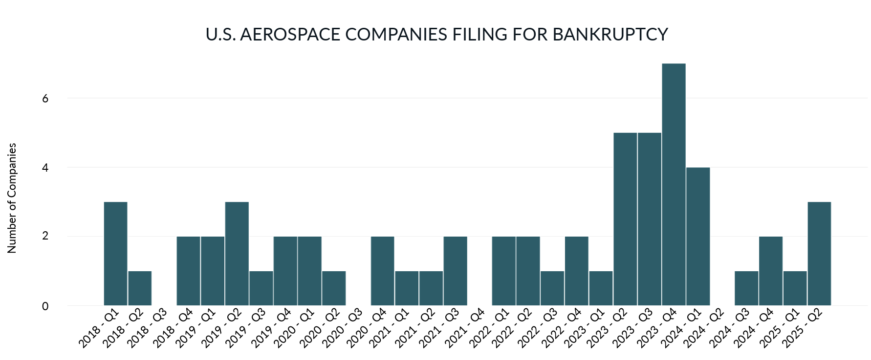 Vulnerabilities in the DIB are compounded by downturns in the economy, which increase the likelihood that companies exit the market or go out of business. Figure 2 shows that the combination of rising inflation, higher interest rates, and the unwinding of COVID-19 financial assistance in FY2023 led to a spike in bankruptcies in the critical U.S. aerospace industry. Among the 57 companies that have filed for bankruptcy since FY2018, half are authorized part suppliers to the DoD and 10 are single- or solesource suppliers for 764 parts. Moreover, 30 of these companies are direct suppliers to one or more major prime contractors, including Boeing, Rolls Royce, Textron, and Lockheed Martin. By disrupting the supply chain for critical components, such bankruptcies have the potential to significantly degrade mission readiness leading to parts shortages, maintenance delays, and reduced operational availability of weapon systems.
