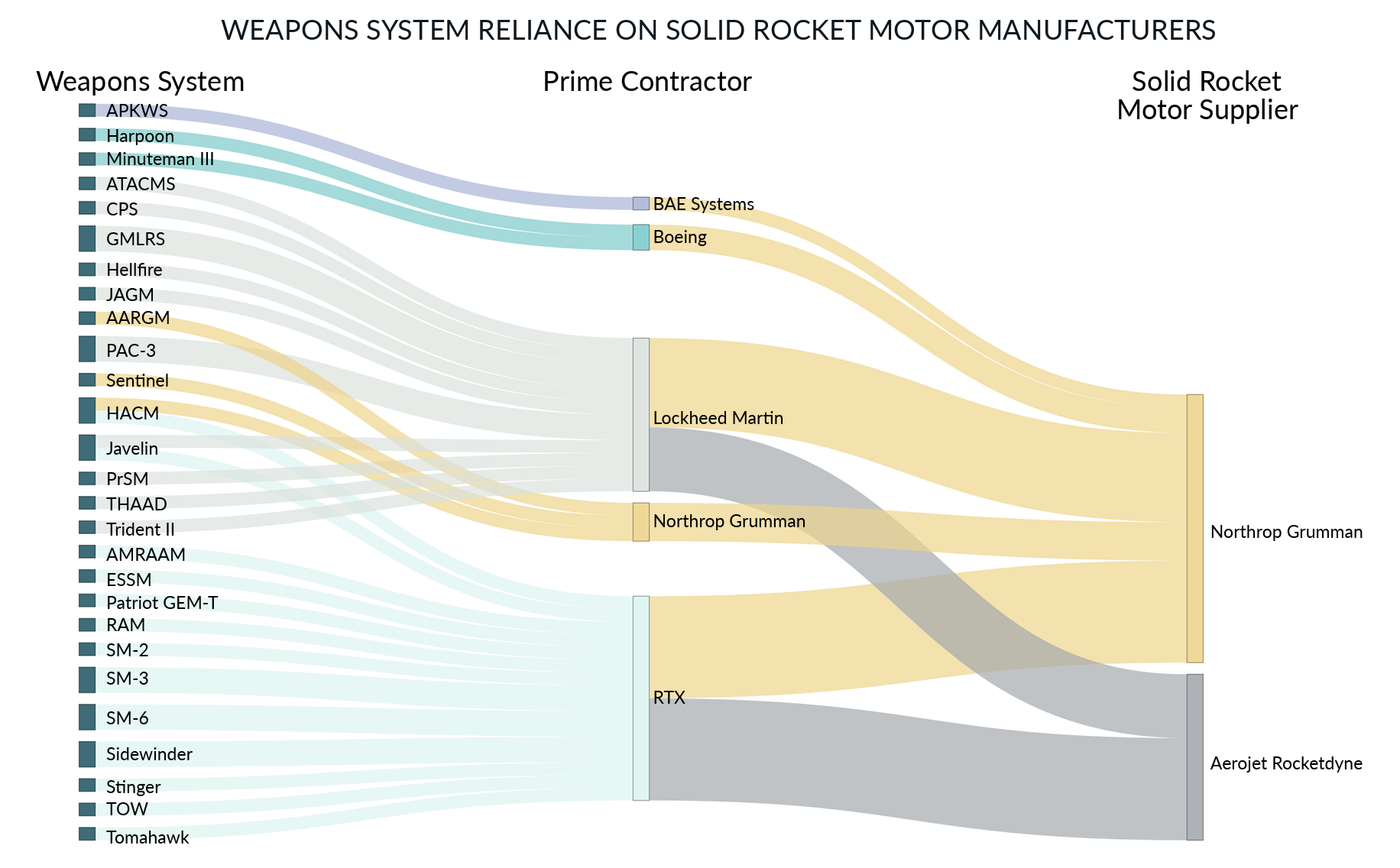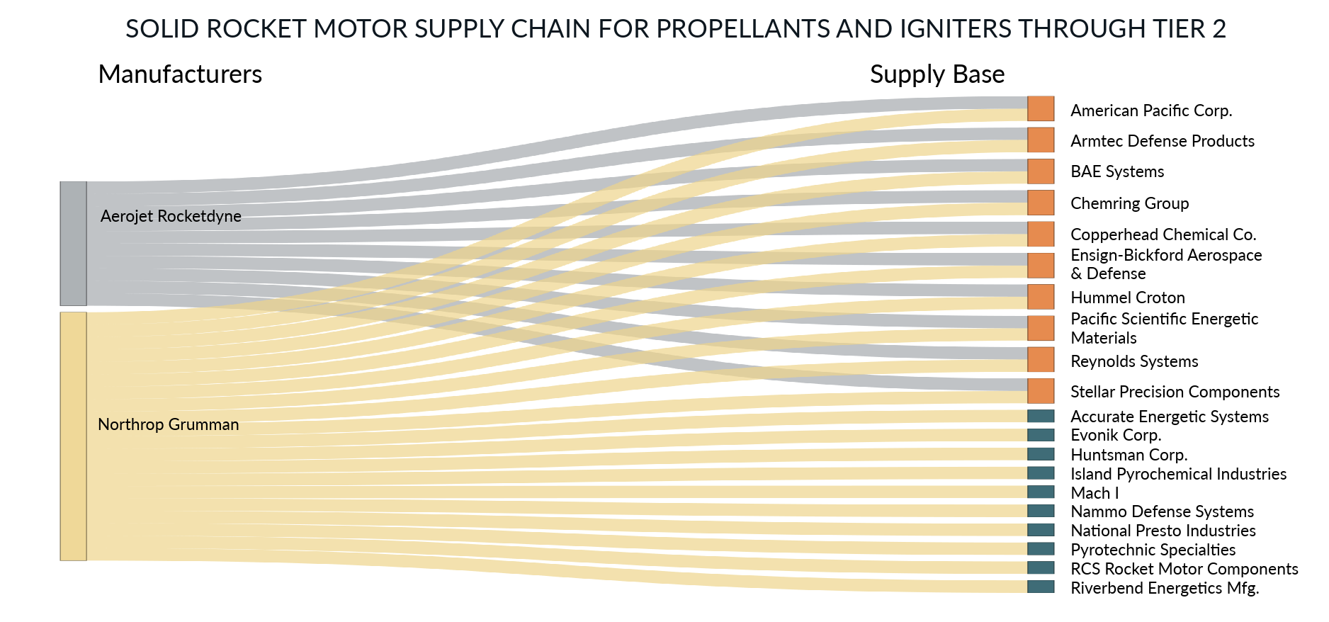 While Northrop Grumman and Aerojet Rocketdyne operate as competitors, their supply chains are critically intertwined. The lack of visibility beyond the first tier of the supply chain masks a highly concentrated and fragile sub-tier industrial base for production of critical energetic components and materials necessary to manufacture dozens of critical weapons systems. A disruption at a single sub-tier supplier could have systemic consequences, halting production at both of the nation’s most essential solid rocket motor manufacturers. This, in turn, would have a cascading effect on the production of some of the most essential weapons systems for U.S. operational success and deterrence.