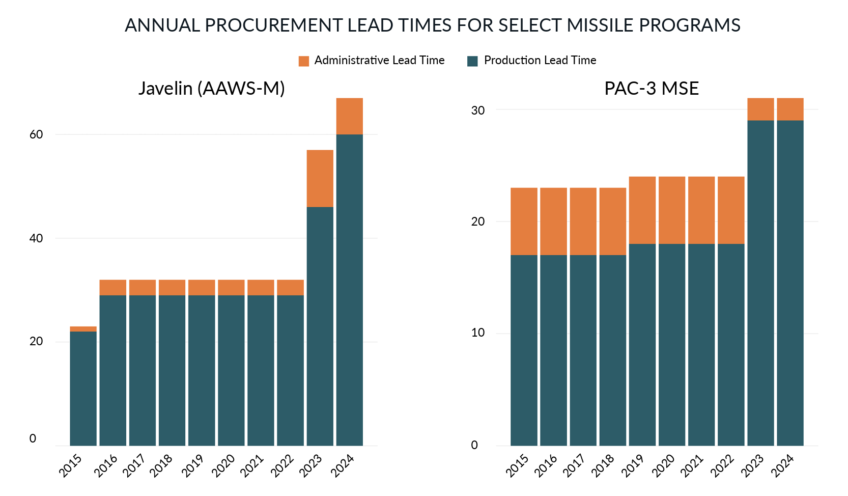 As shown in Figure 6, increased demand for Javelins has resulted in a significant increase in the total procurement lead time (the amount of time from contract award until delivery of the first unit) from 32 months (2016-2022) to 57 months in 2023 and 67 months in 2024. This is a major jump in the wrong direction and comes despite reductions in the maximum production capacity for the Javelin—from 6,480 in 2020 to 2,100 in 2024. In recent years, even modern weapons systems like the PAC-3 MSE have experienced increased lead times. Such latency coincides with recent demand surges for the PAC-3 MSE by allies including Ukraine, Israel as well as for defending U.S. bases in the Middle East from retaliatory strikes by Iran.