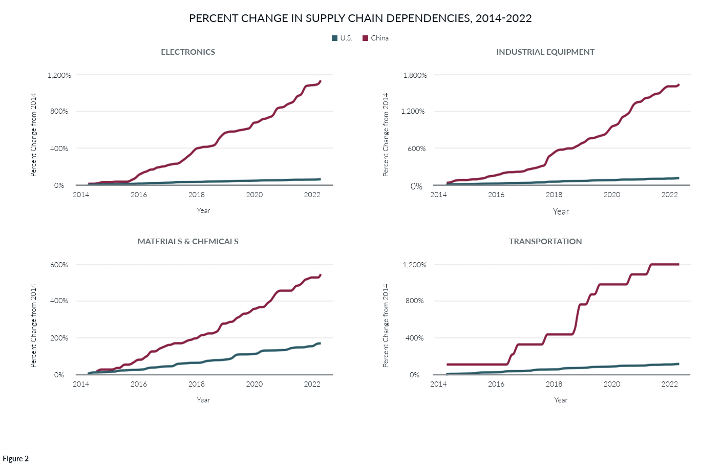 While China cranks out advanced weapons at a prodigious rate, it has also embedded itself in the supply chains for vital components of U.S. military platforms and weapons systems, creating U.S. reliance on the Chinese industrial base. Data from Govini’s Ark.ai, the software system for defense acquisition, shows that between 2005 and 2020, the level of Chinese suppliers in the U.S. supply chains quadrupled (Figure 1). In categories such as electronics, industrial equipment, and transportation, China’s expansion is even more pronounced. Between 2014 and 2022, U.S. dependence on China for electronics increased by 600% (Figure 2).