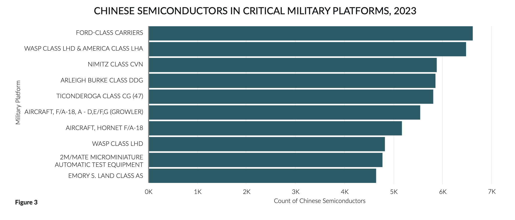 U.S. companies at the bottom of the supply chain pyramid often source these parts from China in open market transactions. As a result, many essential components in sensitive U.S. military systems now come from China. Countless major weapons platforms are vulnerable (Figure 3). Dependence on China for microelectronics, including semiconductors, packaging, and more, is particularly acute. Embedded in nearly every U.S. weapons system, semiconductors are foundational to U.S. military advantage. During a May 2023 visit to a Lockheed Martin missile factory in Alabama, President Joe Biden told employees that each Javelin anti-tank weapon produced there includes more than 200 semiconductors. Analysis from Ark.ai has found that more than 40% of the semiconductors that sustain DoD weapons systems and infrastructure depend on Chinese suppliers (Figure 4). Chinese semiconductor suppliers are inextricably linked to vital DoD weapons supply chains, such as the B-2 Bomber and Patriot air-defense missile (Figure 5).
